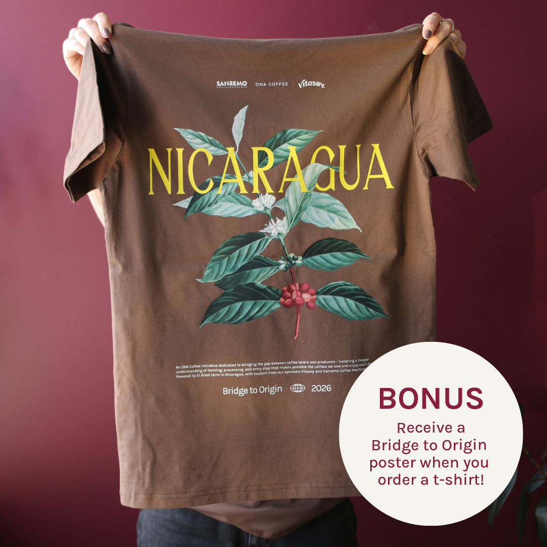 The design celebrates Nicaragua and the upcoming Bridge to Origin 2026 journey—an experience dedicated to bringing coffee professionals closer to the people and places behind every cup.
