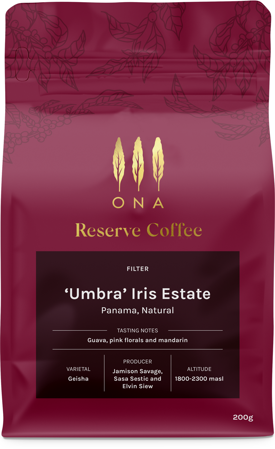 Iris Estate, located on the volcanic slopes of Volcán Barú in Panama’s Chiriquí region, is renowned for its innovative approach to coffee cultivation. Founded by Jamison Savage, Sasa Sestic, and Elvin Siew in 2017, the estate is committed to pushing the boundaries of coffee production while honouring nature and terroir. The 'Umbra' Natural Geisha lot exemplifies this ethos, employing a climate-controlled slow natural method to accentuate the purity and depth characteristic of the “Umbra” series.